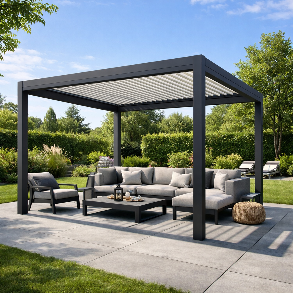 Nowoczesna pergola z regulowanymi lamelami,zapewniająca komfort przez cały sezon.